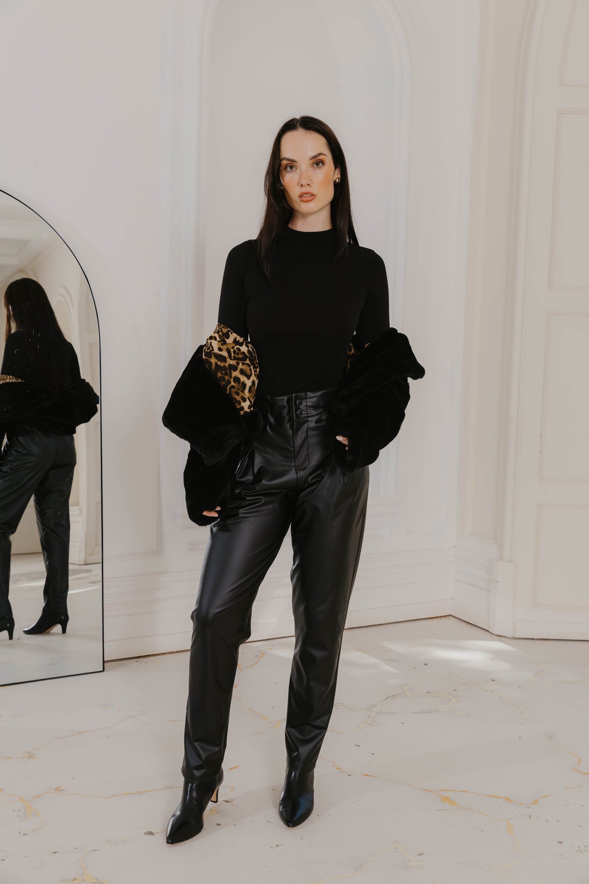 Make a bold statement with these high-waisted faux leather trousers, designed to combine structure, edge, and effortless style. Crafted from a smooth, glossy finish, these trousers feature a flattering gathered waistband with a tailored front fly, adding definition to the waist.