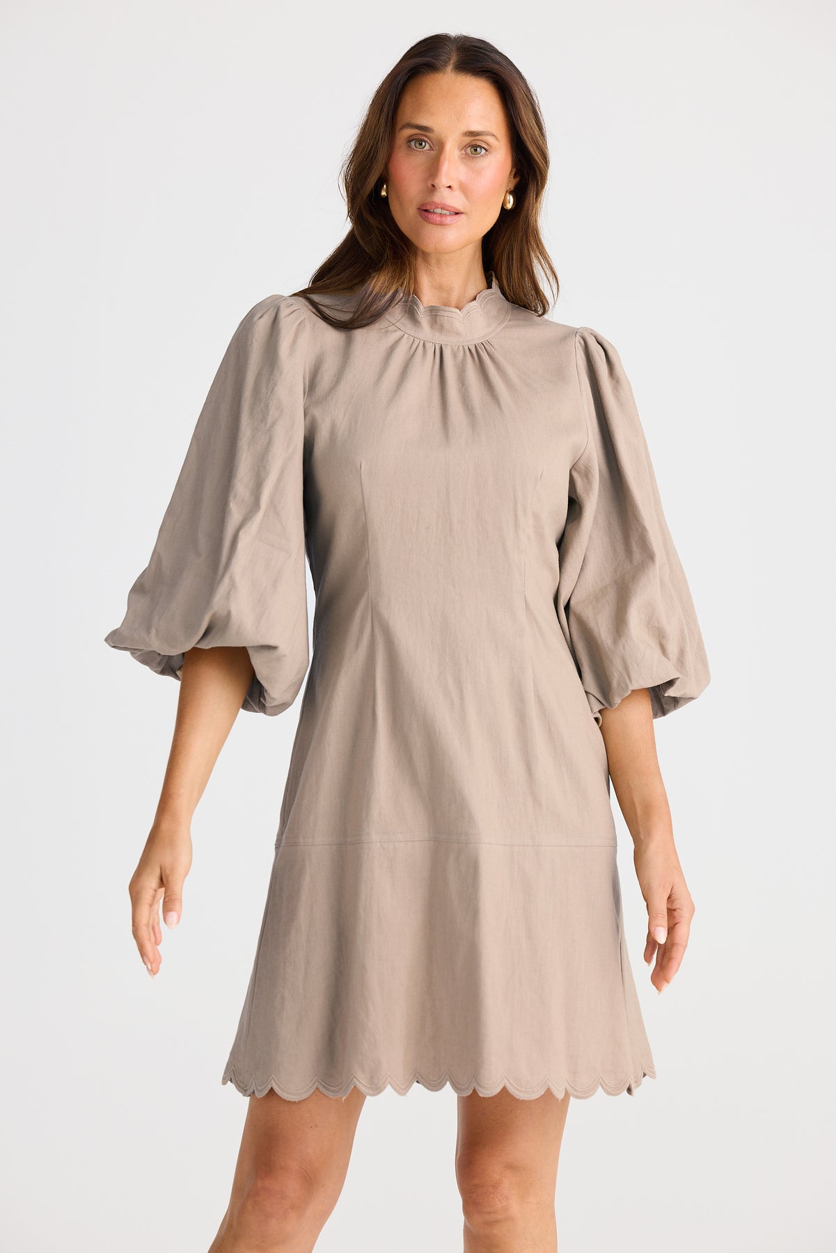 Sophisticated, sleek, and effortlessly polished—the August Dress is the ultimate modern classic. It features a structured silhouette with a refined mock neck and statement puffed long sleeves that gather gently at the cuffs for soft volume. The dress skims the body with a straight-cut knee-length hem, offering a flattering and elegant fit.