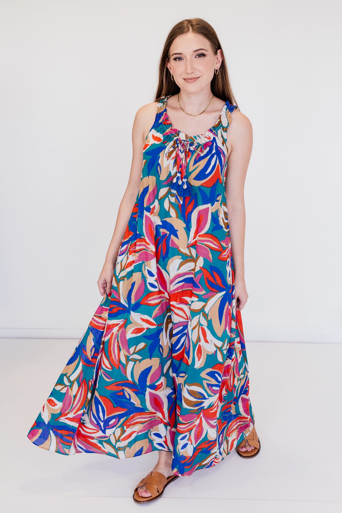 Complete the look with strappy sandals and bold earrings for an easy, standout summer ensemble.