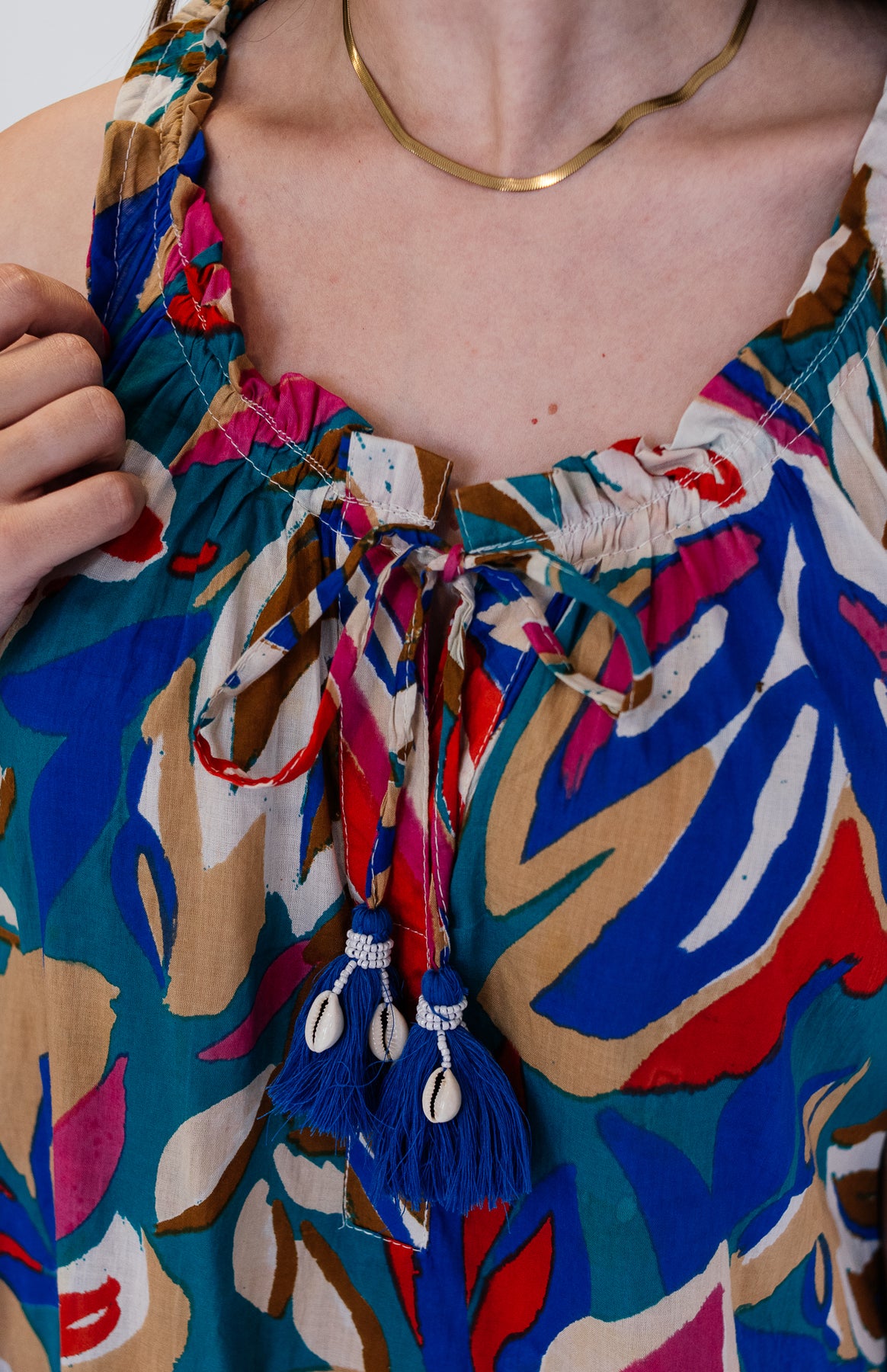 Make a vibrant statement in this playful sleeveless maxi dress, adorned with a colourful all-over print that radiates fun and energy. Designed with a flattering front tie detail, it cinches the waist beautifully while adding a touch of charm. The flowy silhouette and lightweight fabric make it perfect for sunny days and effortless movement.