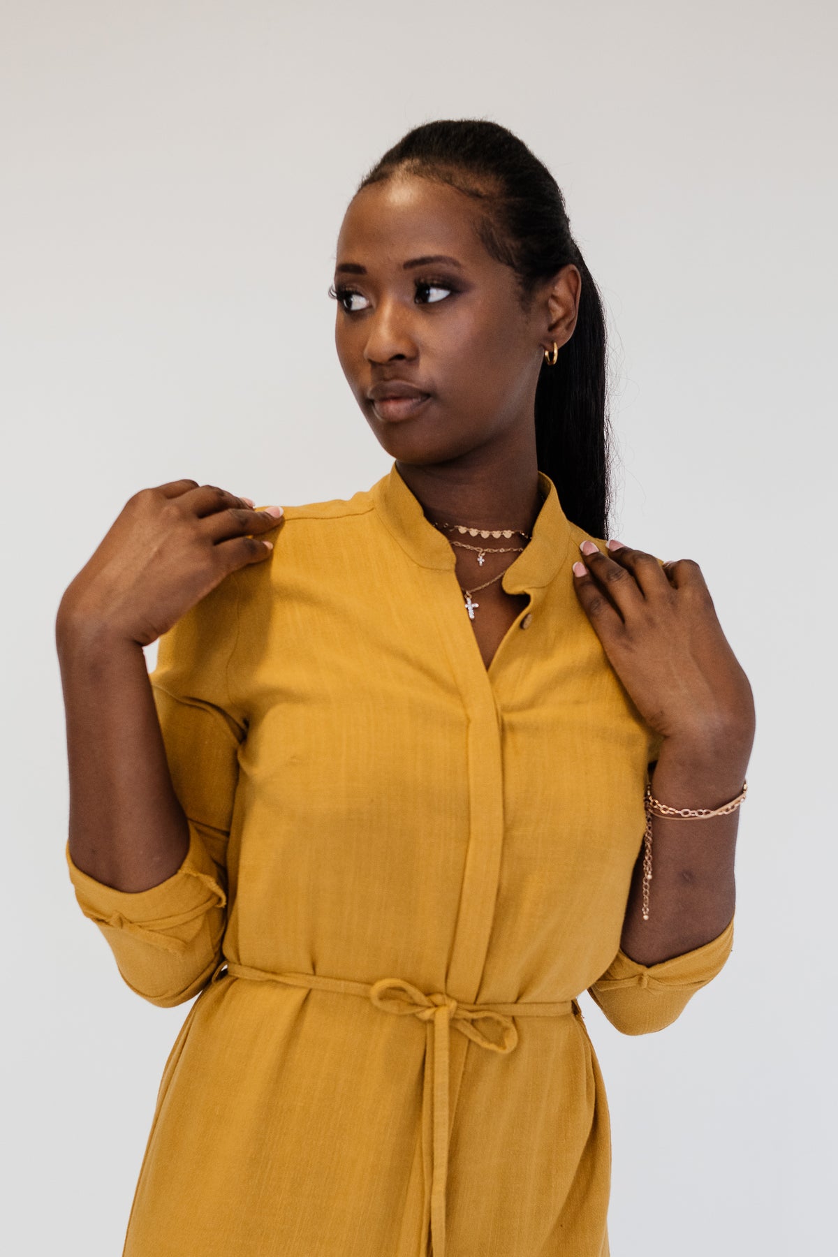 This elegant linen dress combines relaxed comfort with refined style. Featuring a full button-down front and a thin, adjustable belt, it cinches at the waist for a flattering silhouette. The long sleeves with subtle cuff details add a polished touch, while the breathable linen fabric ensures lightweight, all-day comfort. Perfect for both casual outings and more dressed-up occasions.