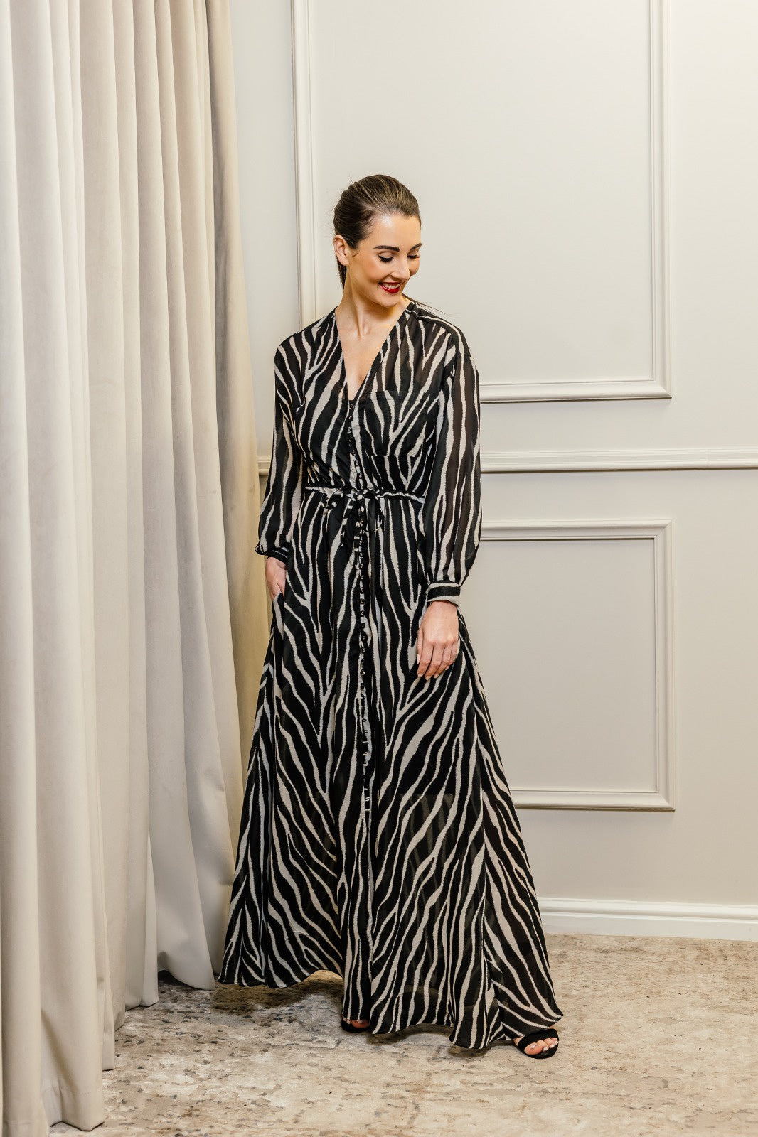 Make a fierce yet refined statement in the Zebra Jasmine Dress , a boutique showstopper designed for the woman who leads with bold style. Featuring an all-over zebra print that blends safari-inspired edge with high-fashion elegance, this maxi dress is crafted from a breathable, flowy fabric that moves effortlessly with every step.