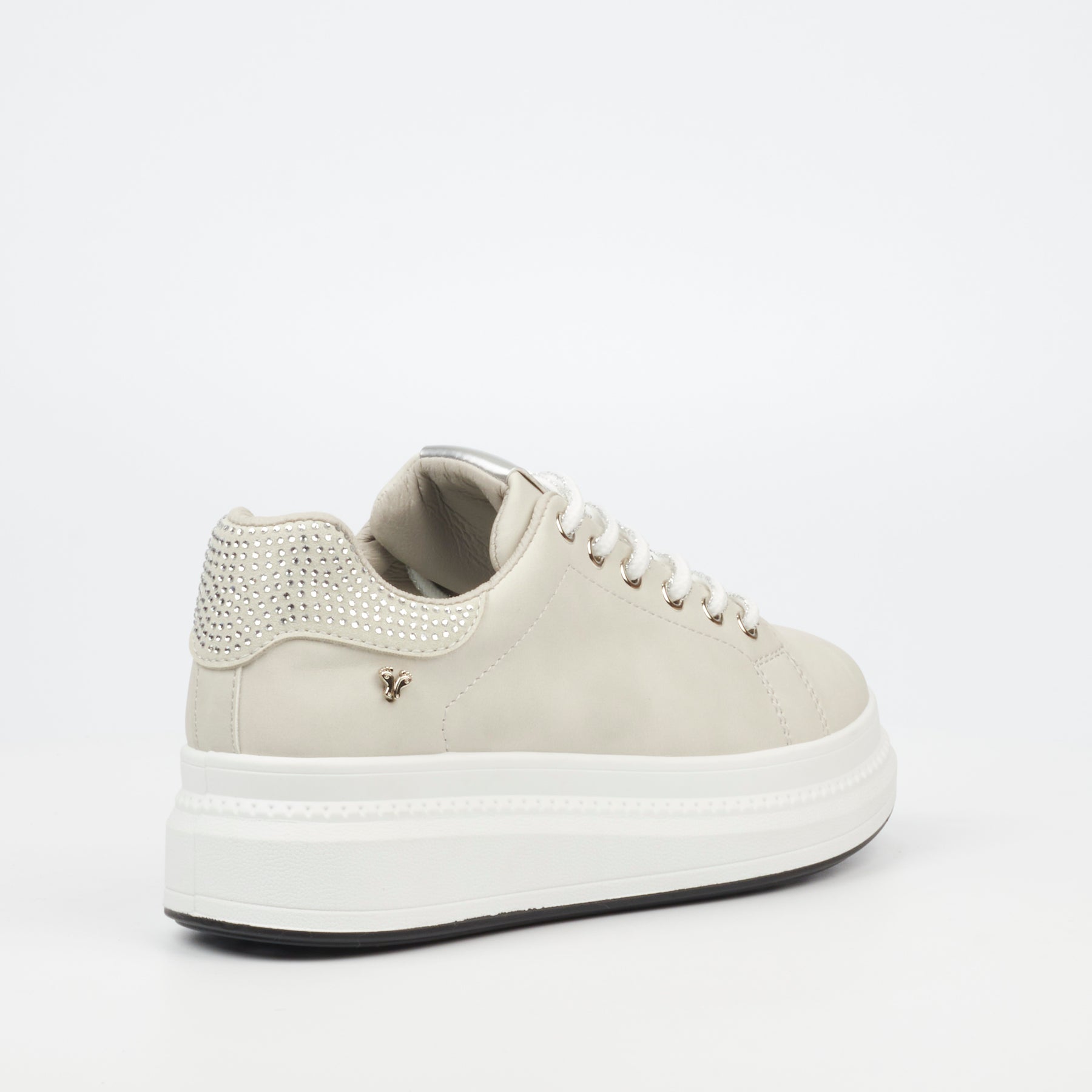 Add a sparkling edge to your casual footwear with this stylish sneaker. Designed with a classic round toe, it combines comfort and contemporary flair. The diamante trim on the back heel catches the light for a subtle, glamorous finish, while the lurex-trimmed shoelaces add a metallic shimmer that elevates the overall look. Perfect for those who want everyday comfort with a touch of sparkle.