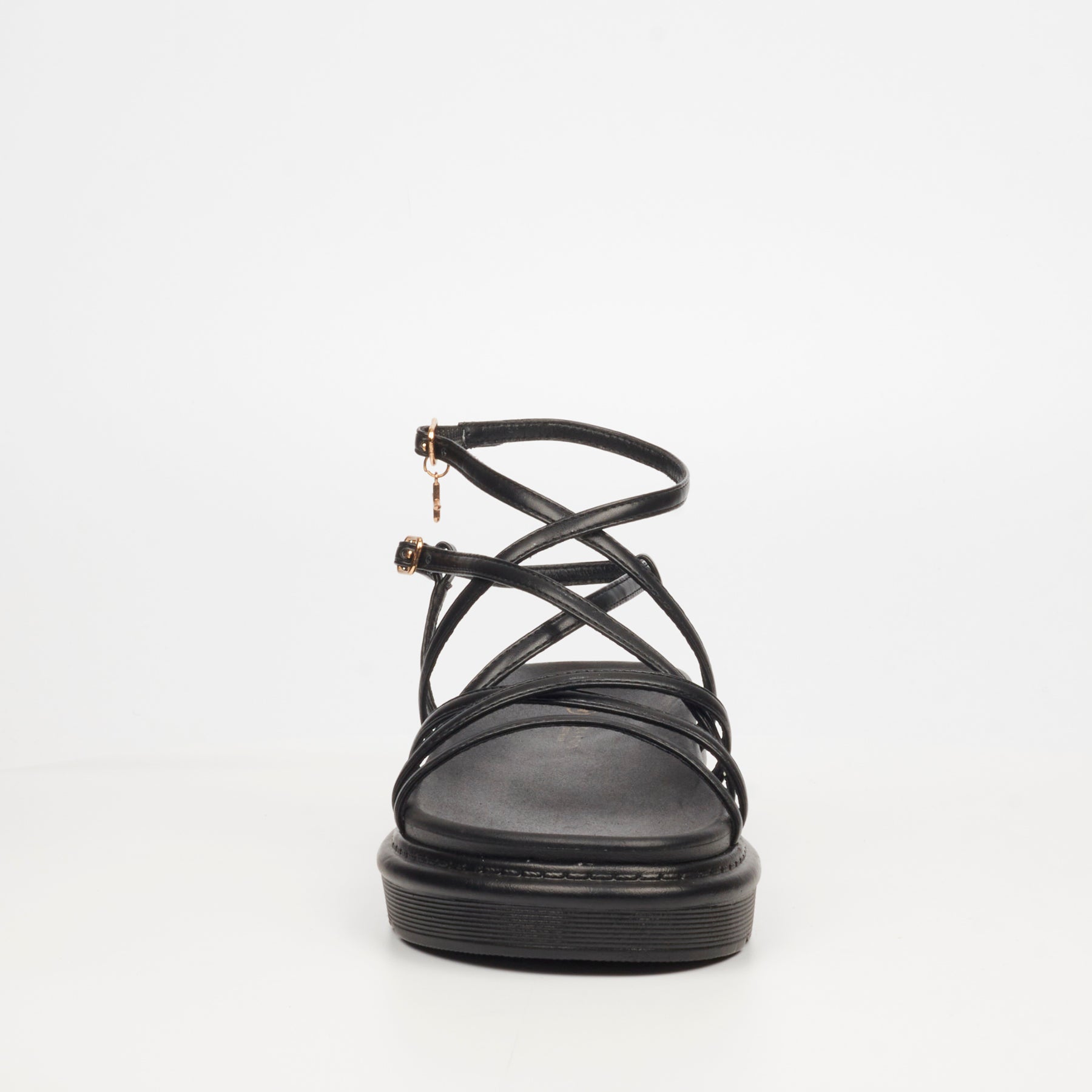 Minimalist and modern, this black flat sandal is designed with sleek double straps and a unique toe loop detail, finished with a small gold-tone accent for a touch of elegance. Its streamlined silhouette and flat sole make it a versatile choice for both casual and dressier looks.