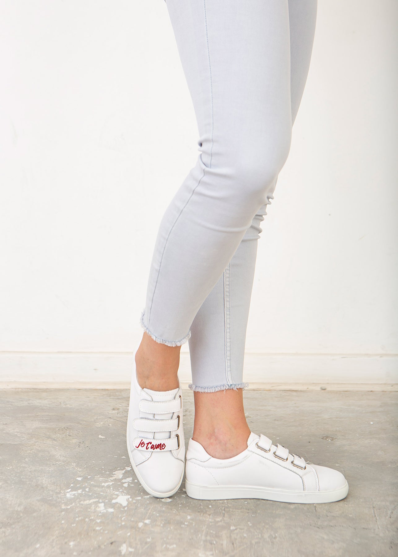 Step into bold, street-style flair with these sneakers. Crafted from premium leather, these sneakers offer a sleek, modern edge with an easy-to-wear velcro closure. The standout feature? Eye-catching written words printed across the straps, adding a playful, urban-inspired touch.