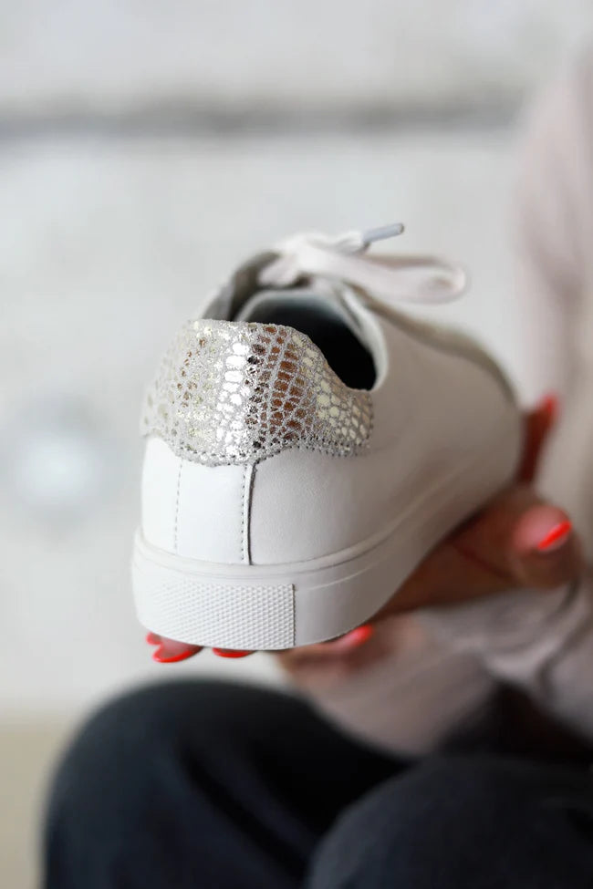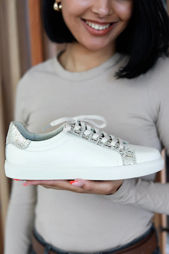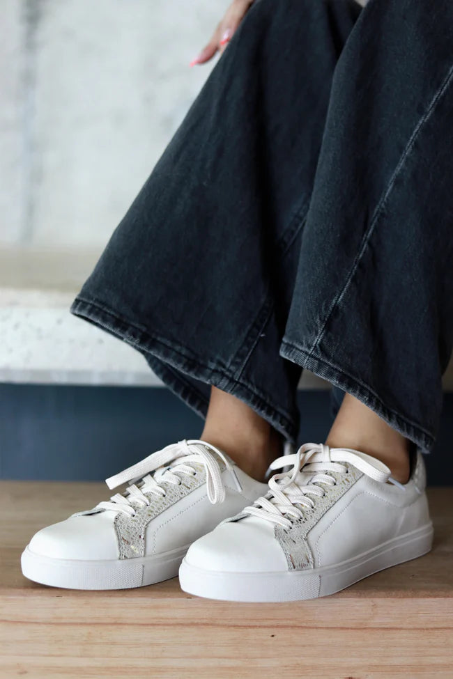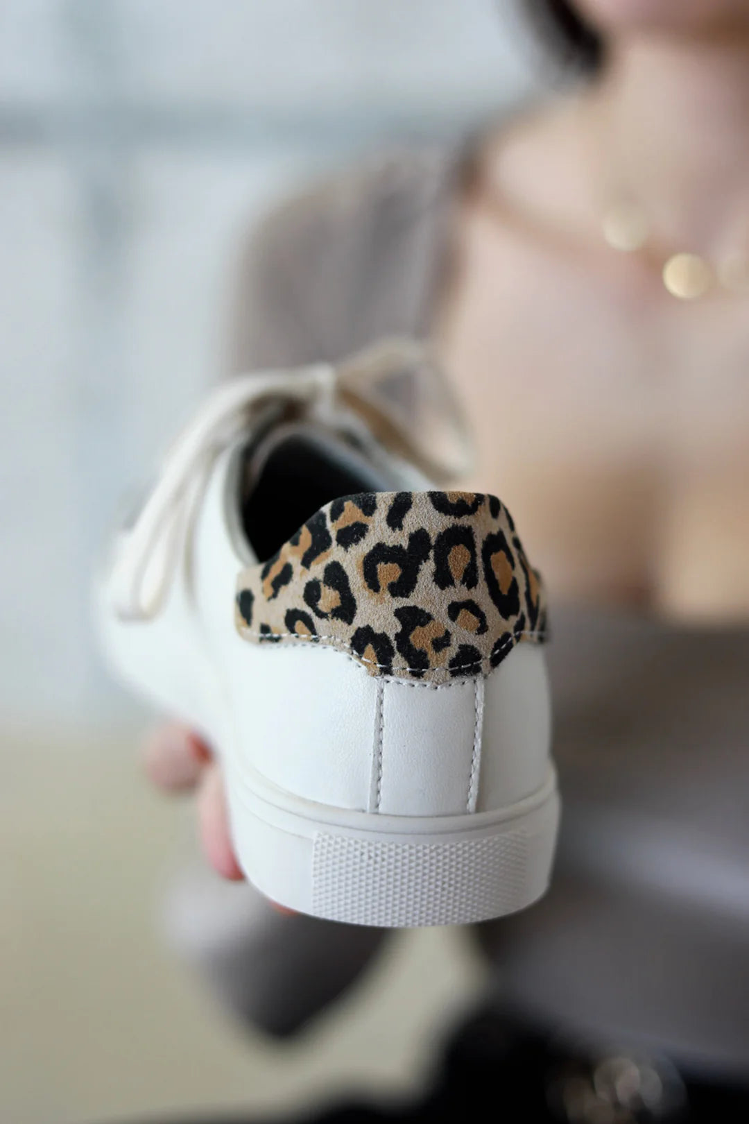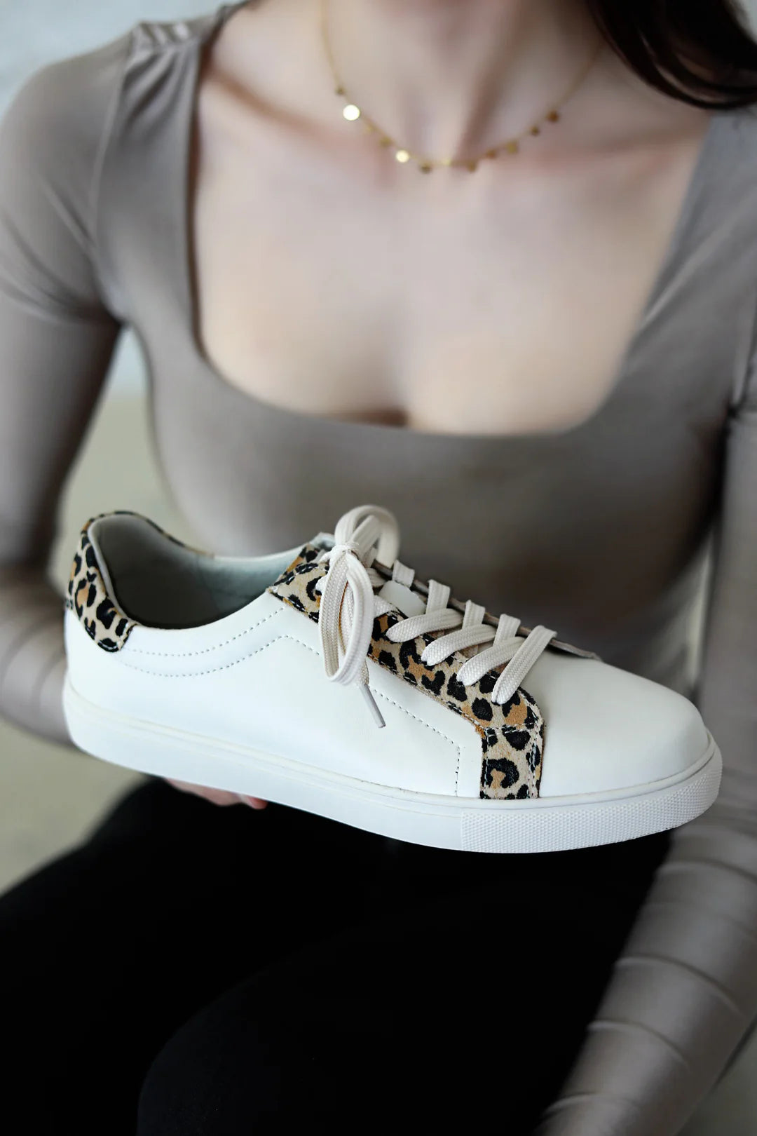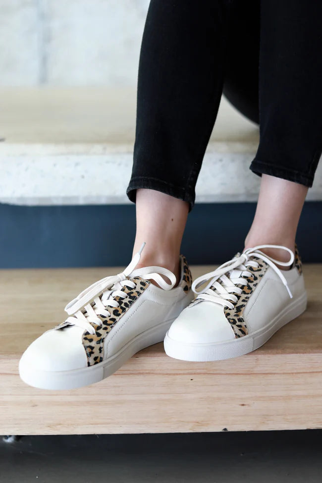 Designed with the ease of a slip-on and the look of classic lace-ups, these sneakers combine comfort with a bold, trendy edge. The soft white upper is perfectly contrasted by the playful animal print on the sides, making them the ideal pair to add a pop of personality to any casual outfit.