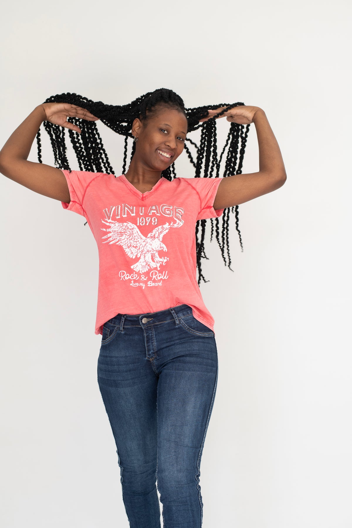 Tuck this tee into high-waisted jeans or a flowy skirt for an effortlessly cool look. Layer with a denim jacket and add sneakers for an easy, go-anywhere outfit.
