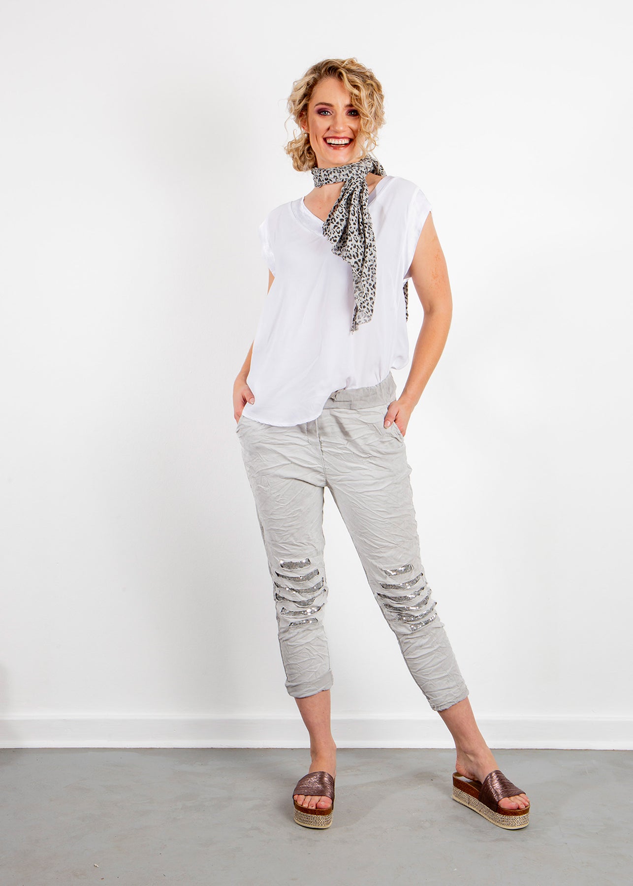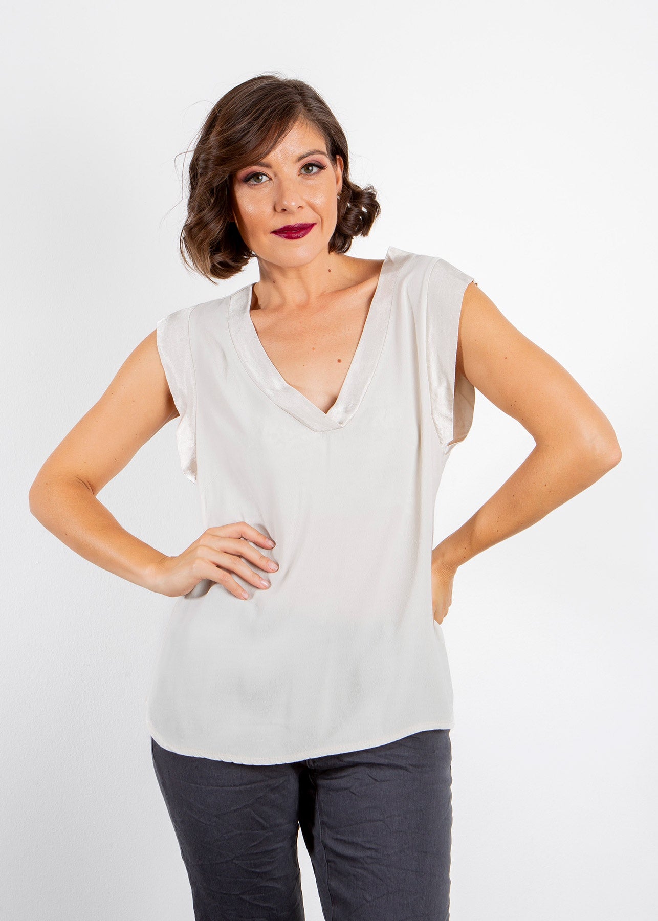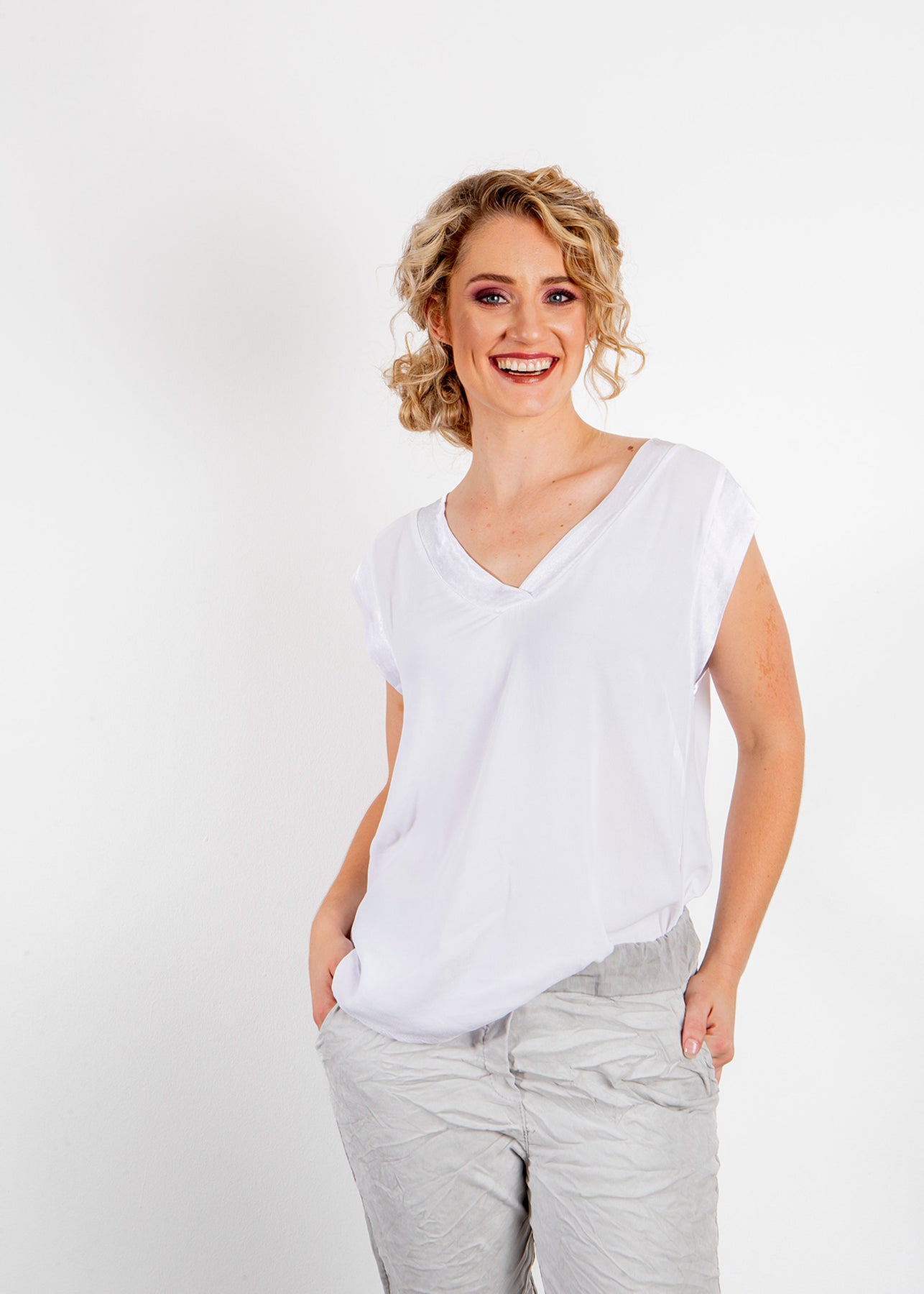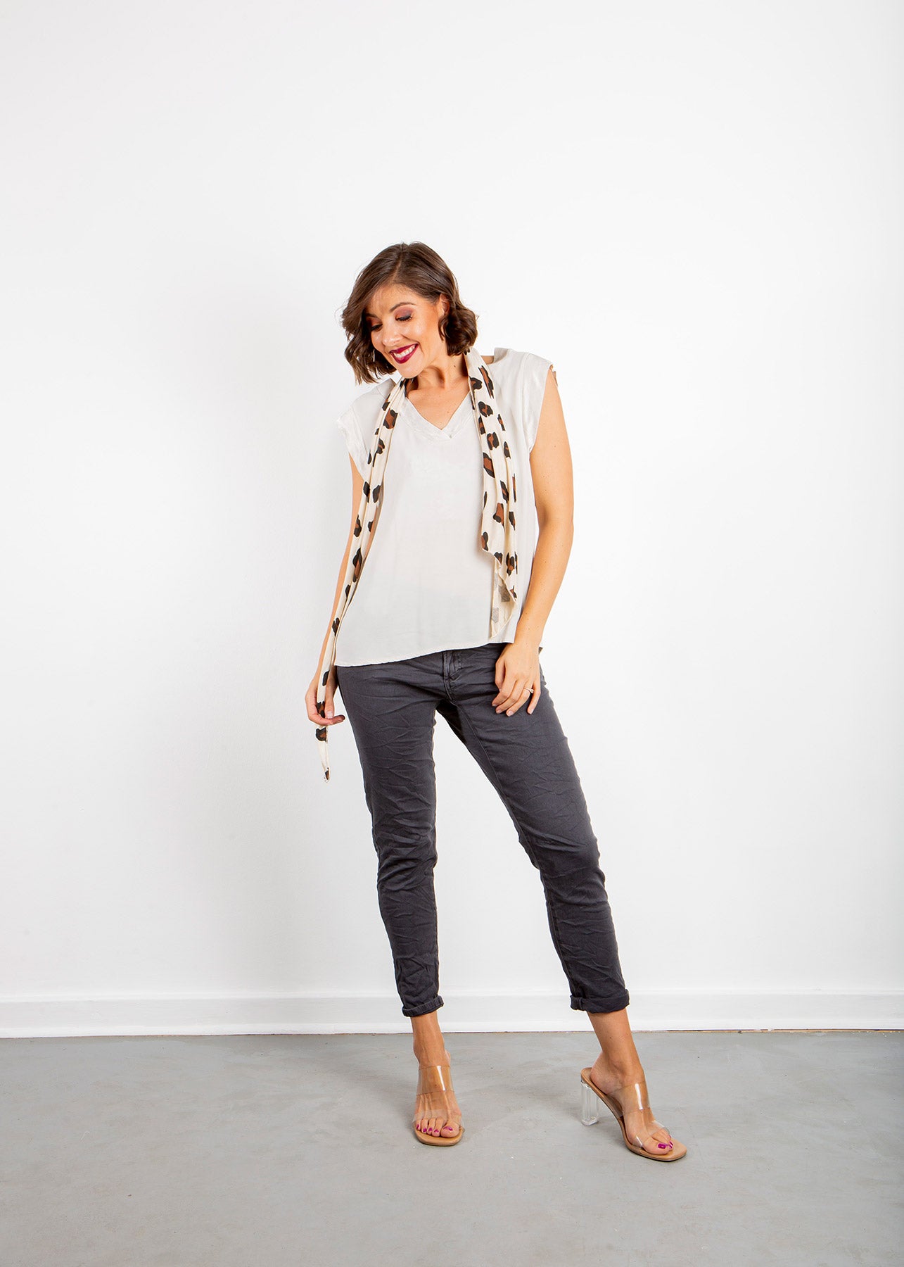 Tuck it into high-waisted jeans or tailored trousers for a clean, polished outfit. For a layered look, pair it with a longline blazer or a soft cardigan and complete the ensemble with loafers or ankle boots.