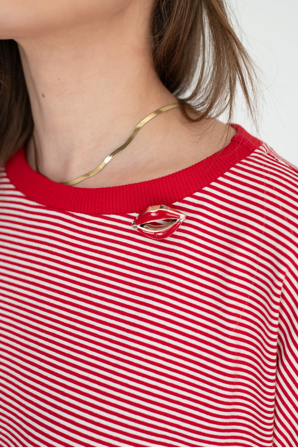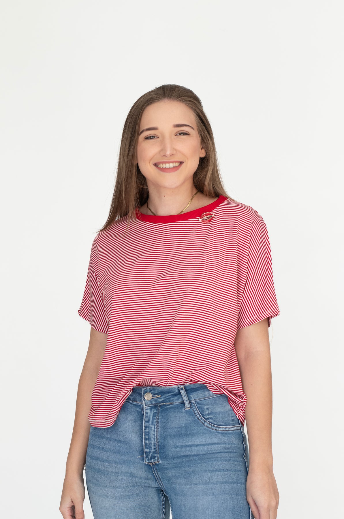 Make a bold statement with our Querida T-shirt, a playful yet timeless addition to your wardrobe. Featuring classic horizontal stripes in a vibrant red hue, this cropped top offers a flattering, modern silhouette that’s perfect for warmer days or layering.