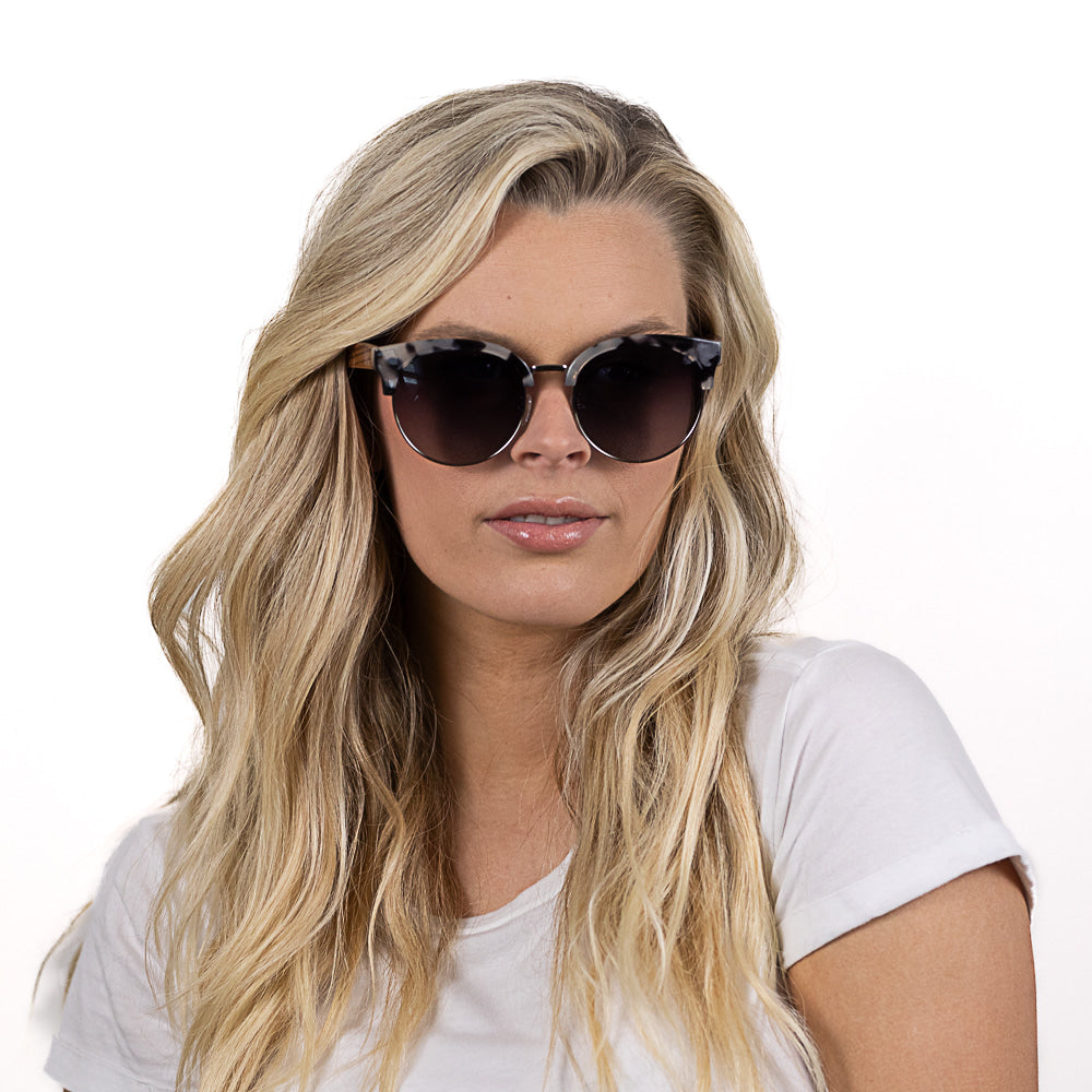 Inspired by the popular 50's style clubmaster, our Heather sunglasses offer a modern twist on this effortlessly cool style. Featuring a a half-rim creamy tortoise front, metal rim and our walnut wood arms, the Heather style can be adjusted to sit comfortably with silicone nose pads and spring loaded hinges.
