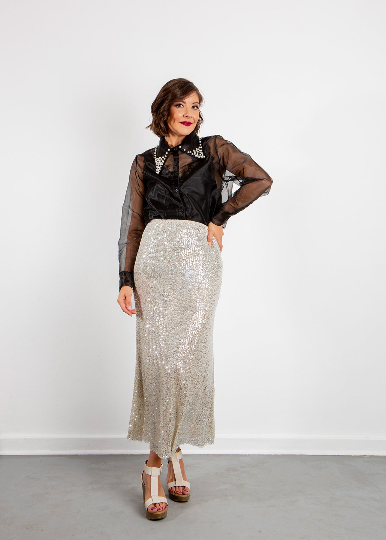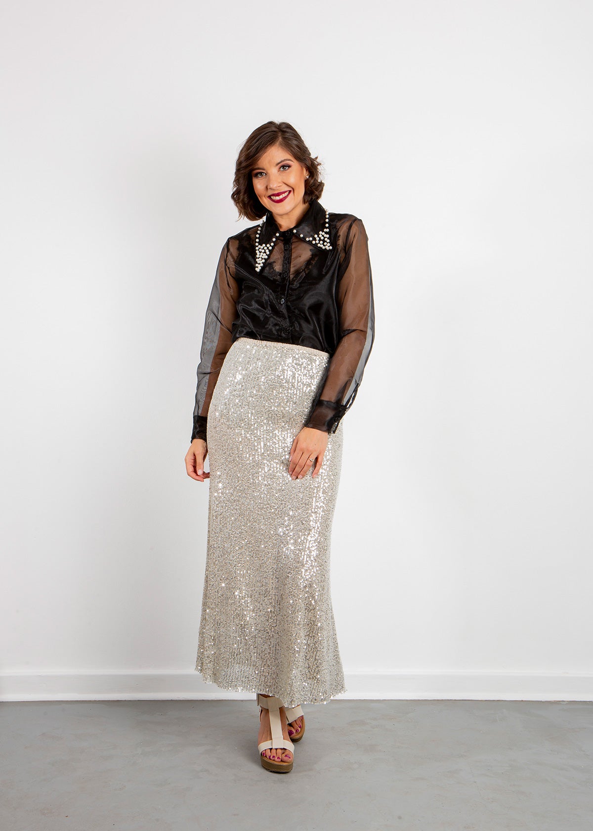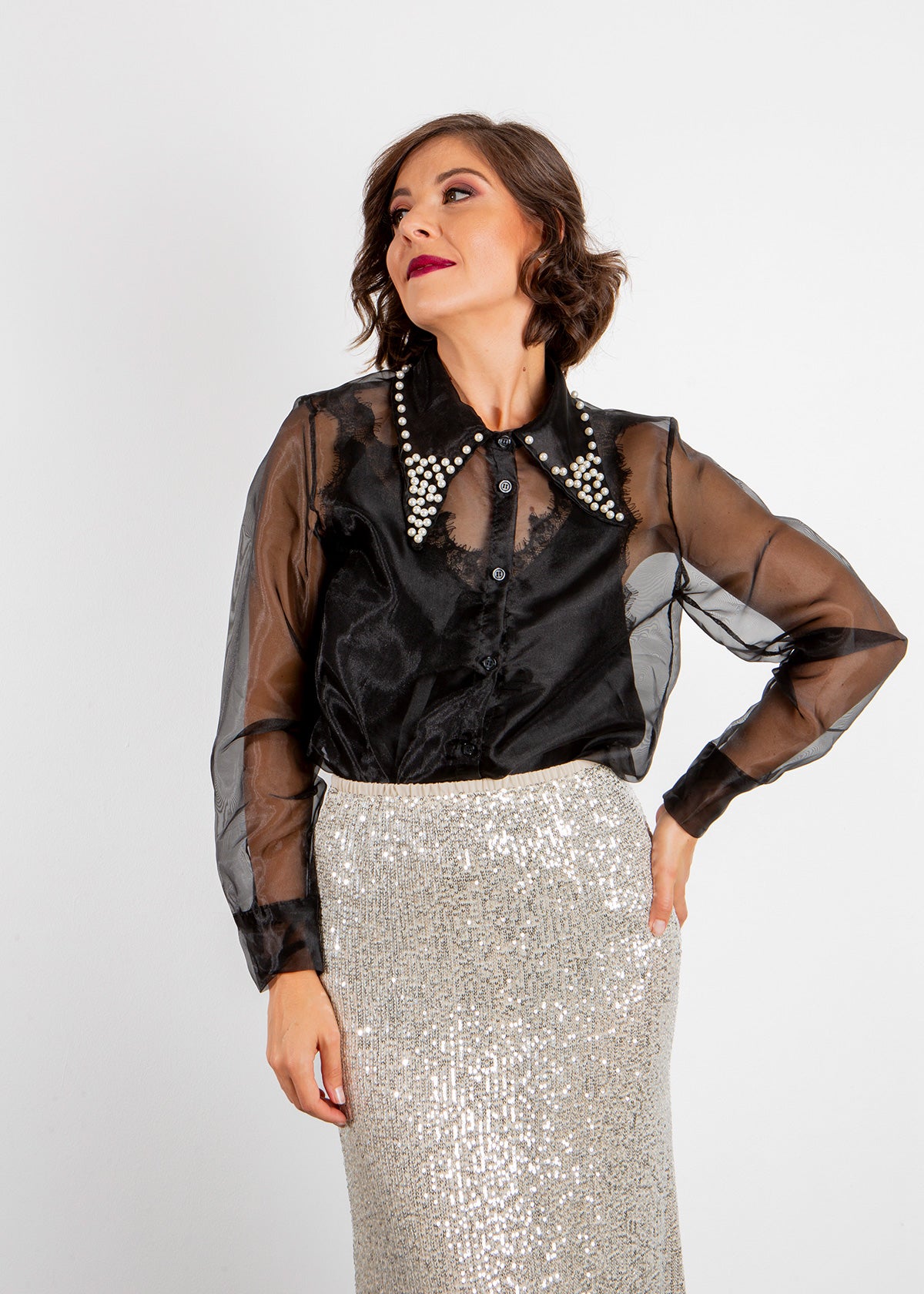 The Emem top features full-length sleeves and pearls by the collar. It can be easily dressed up or down depending on the occasion.