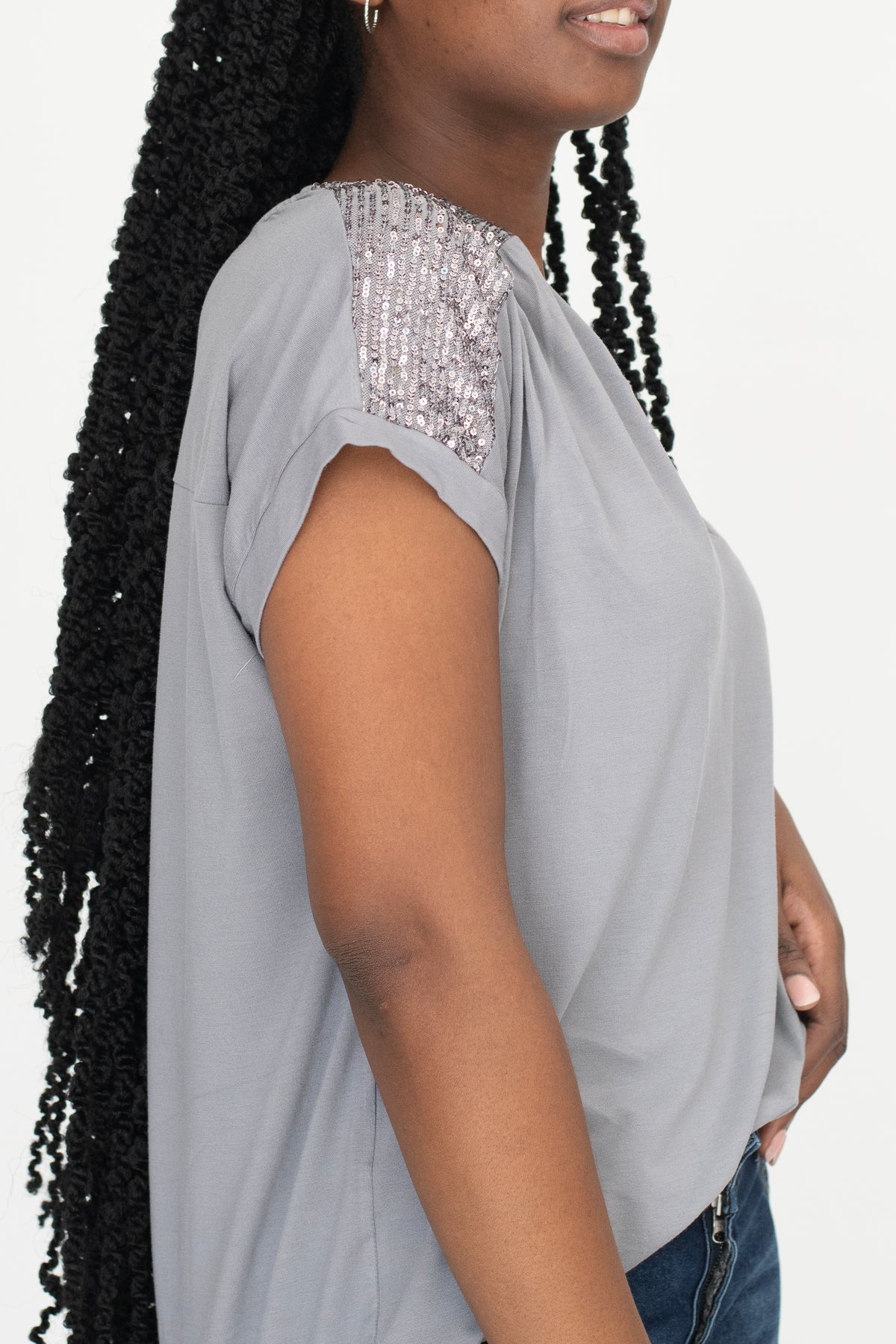 Effortlessly feminine and casually chic, this Yoke Sequin Tee is a versatile wardrobe essential. Designed with delicate sequins along the yoke that create soft, flattering drapes over the shoulders, this tee adds subtle texture to a simple silhouette.